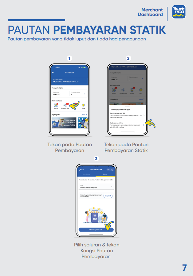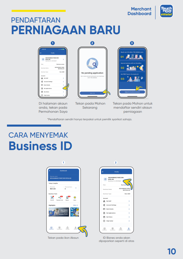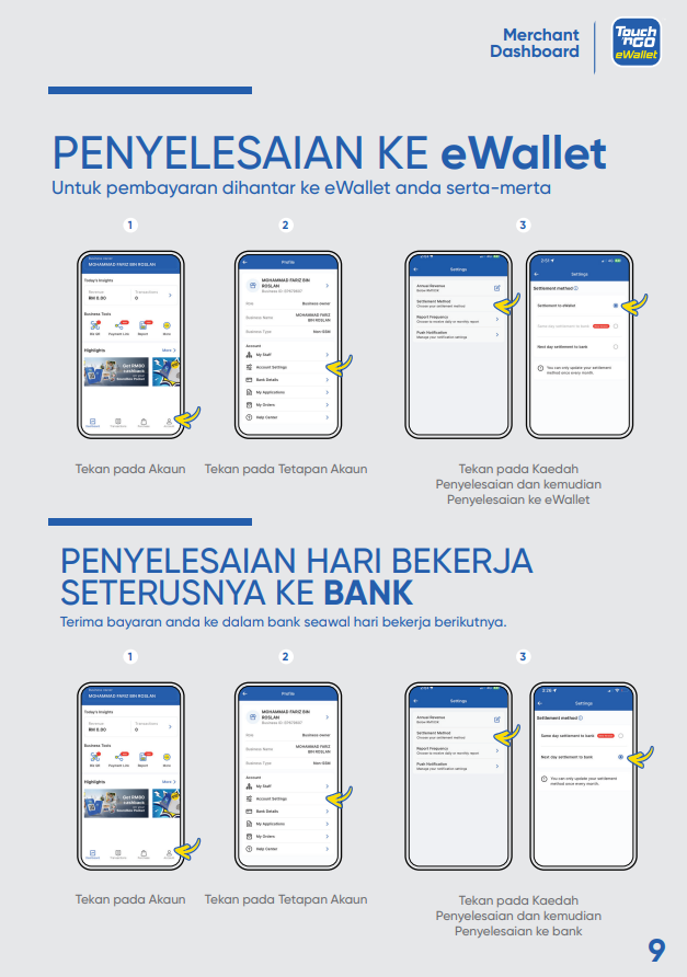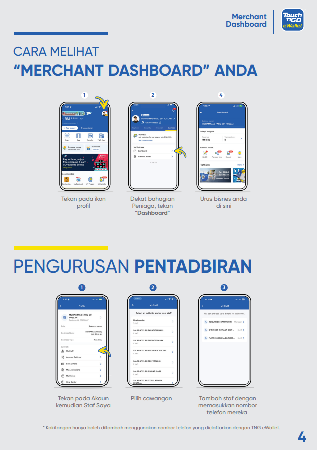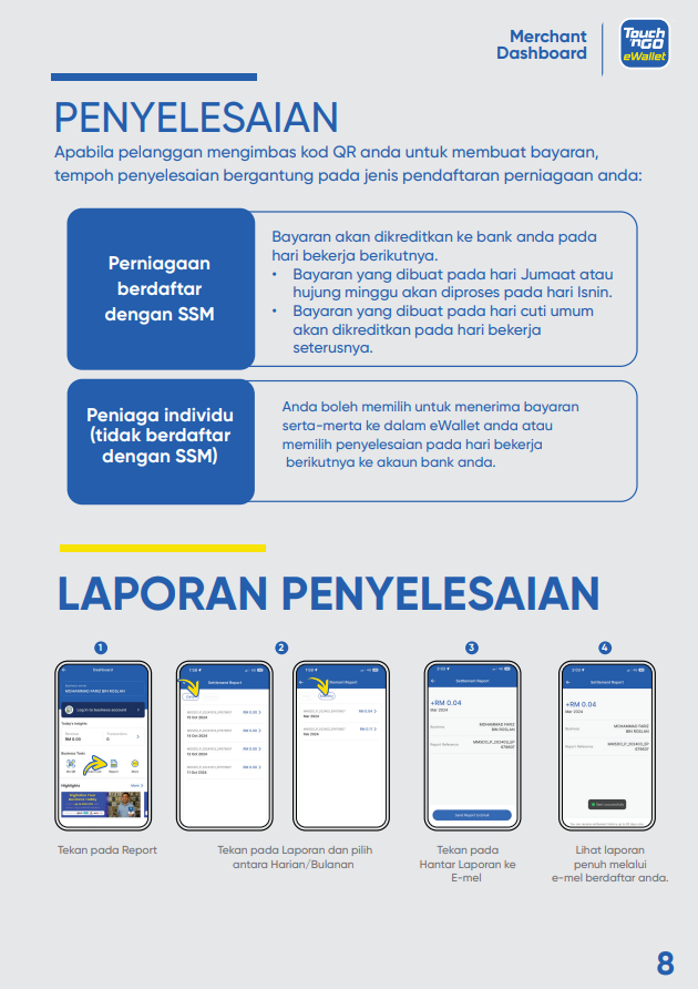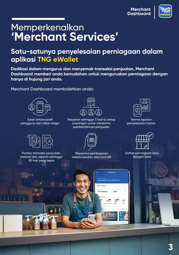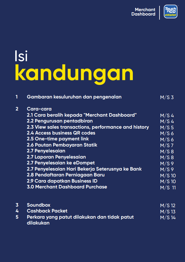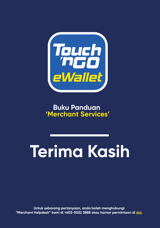 Bagaimanakah saya boleh memuat turun Buku Panduan “Merchant Dashboard”? 15 Ogos 2025 09:35 Terkemas kini Klik SINI untuk memuat turun salinan buku panduan “Merchant Dashboard” ke peranti anda. Artikel berkaitan Bagaimana saya boleh mengakses kod QR menggunakan “Merchant Dashboard" dan mencetaknya? Bagaimanakah cara mendaftar sebagai rakan niaga Touch 'n Go eWallet? Bagaimanakah saya boleh menguruskan cawangan saya di “Merchant Dashboard”? Bilakah saya akan menerima pembayaran? Bagaimana untuk mengaktifkan semula akaun rakan niaga saya?